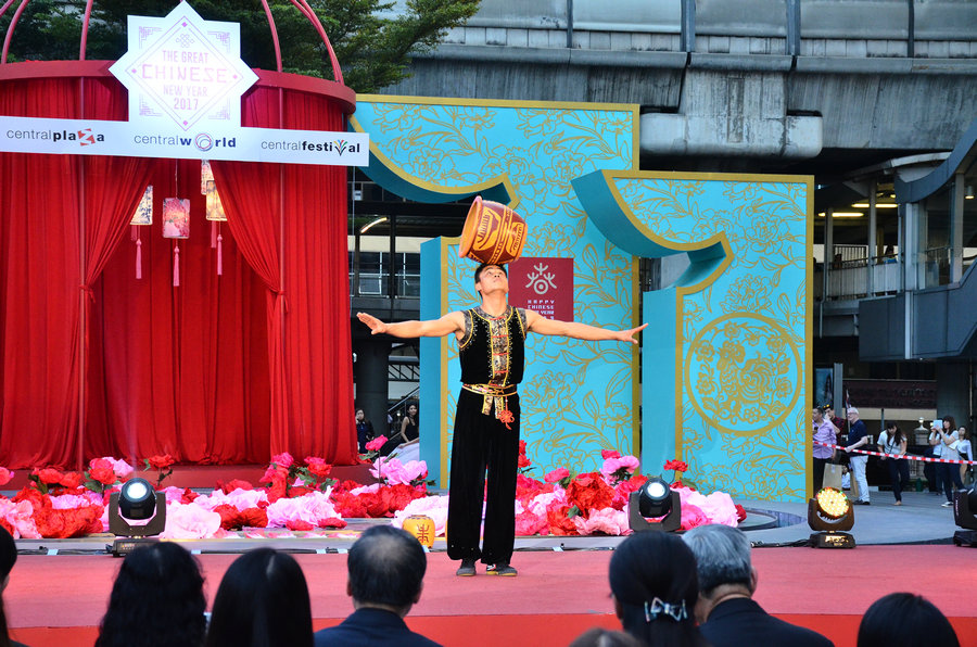 2017年1月19日,泰國曼谷世貿(mào)中心廣場外,河南雜技頂缸表演。[攝影:Mr. Waruth Miksiragul]