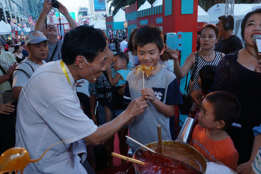 2017年1月21日,泰國(guó)曼谷世貿(mào)中心廣場(chǎng)外,吹糖人非遺展示互動(dòng)。[攝影:Mr. Waruth Miksiragul]