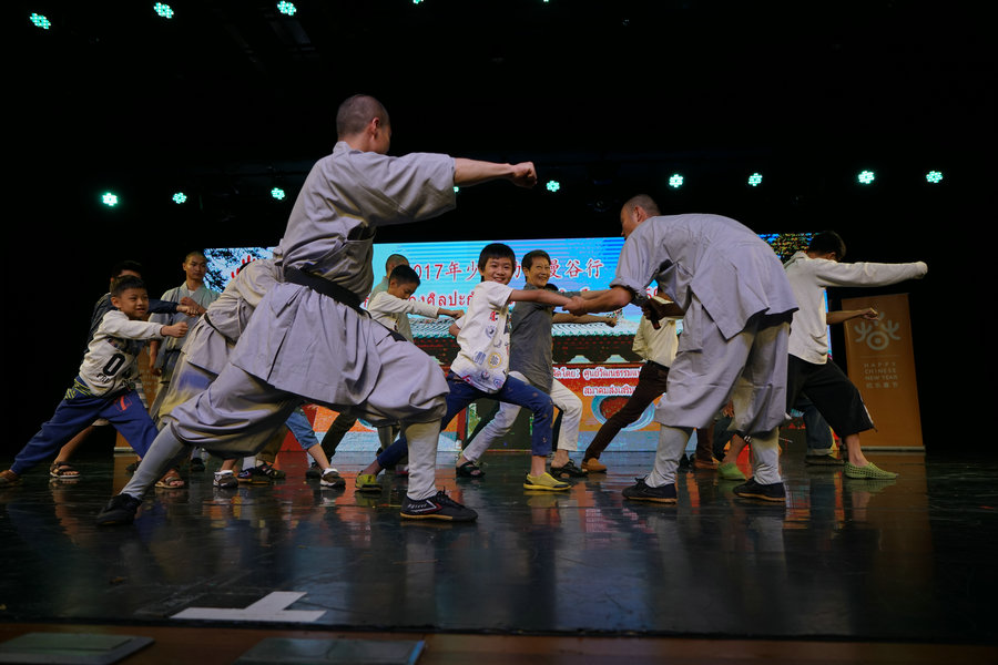 Shaolin monks instruct the audience in Chinese kung fu at the China Cultural Center in Bangkok on Feb 19. [Photo/Chen Mishuo]