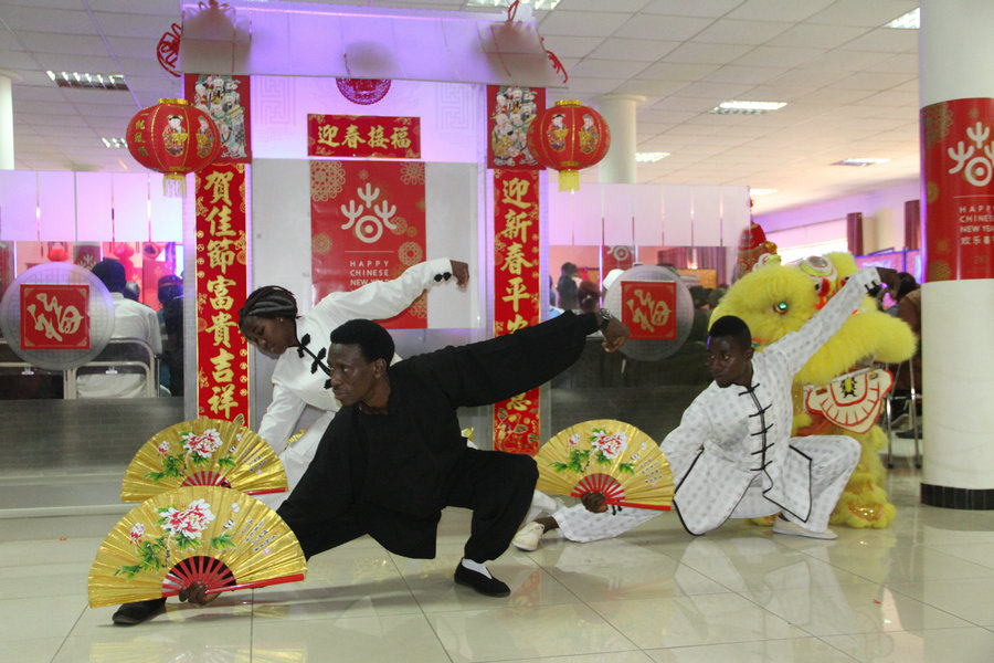 The China Cultural Center in Nigeria holds its first Chinese New Year Fair on January 28, attracting more than 2,000 local people and employees of Chinese-funded organizations. Nigerian kung fu enthusiasts put on a performance. [Photo/Cai Xiaohong]
