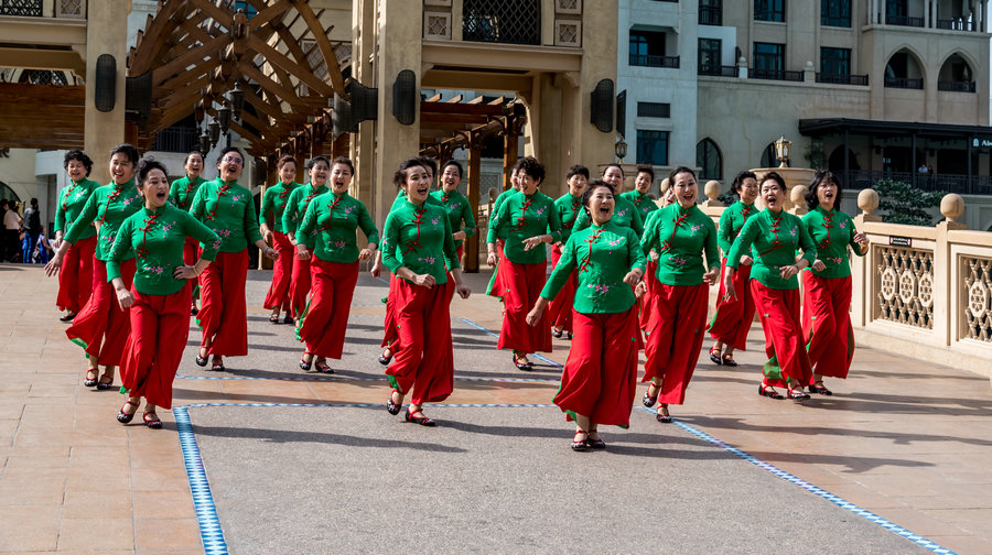 A Chinese New Year flash mob dances in Dubai on Jan 15, 2017. Nearly 400 Chinese from more than 30 countries gathered to celebrate the Chinese Spring Festival with a variety of cultural events. [Photo/Cui Yi]
