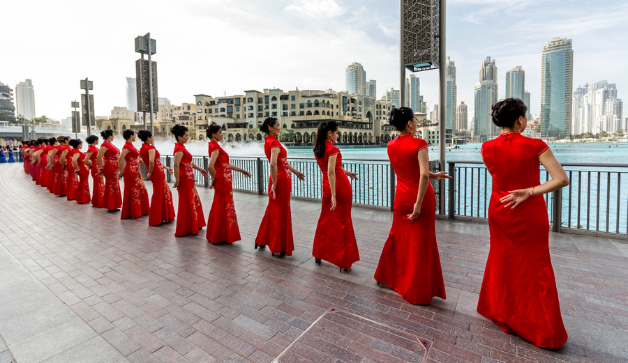 A Chinese New Year flash mob performs in Dubai on Jan 15, 2017. Nearly 400 Chinese from more than 30 countries gathered to celebrate the Chinese Spring Festival with a variety of cultural events. [Photo/Cui Yi]