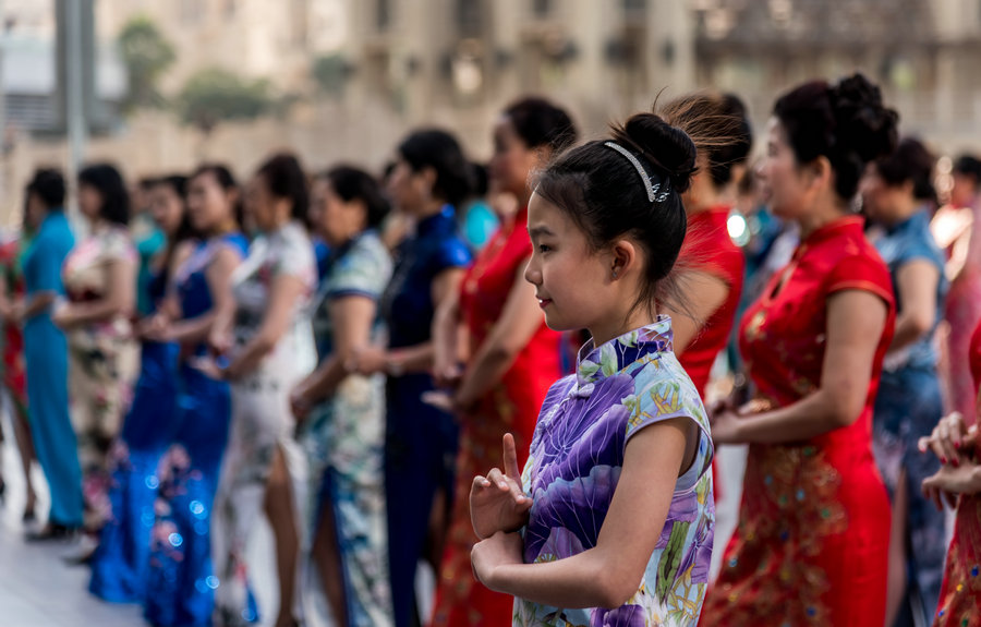 A Chinese New Year flash mob dances in Dubai on Jan 15, 2017. Nearly 400 Chinese from more than 30 countries gathered to celebrate the Chinese Spring Festival with a variety of cultural events. [Photo/Cui Yi]