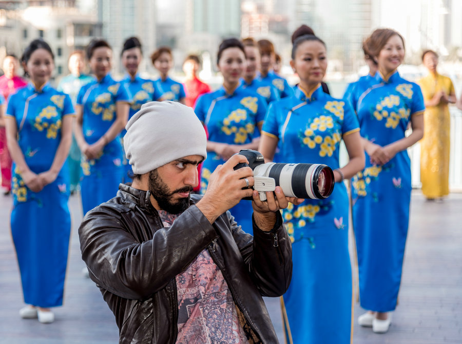 A man shoots a photo of a Chinese New Year flash mob in Dubai on Jan 15, 2017. Nearly 400 Chinese from more than 30 countries gathered to celebrate the Chinese Spring Festival with a variety of cultural events. [Photo/Cui Yi]