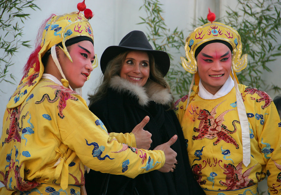 A Portuguese singer poses for a picture with Chinese performers during the Happy Chinese New Year parade in Lisbon on Jan 21, 2017. [Photo/Jin Jie]