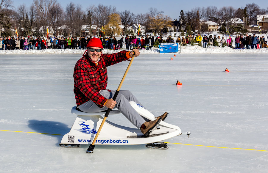 2017年2月18日,加拿大渥太華Dow’s Lake。今年是加拿大政府正式宣布農(nóng)歷正月初一到十五為中國(guó)春節(jié)的第一年,同時(shí)正好也是加拿大國(guó)慶150周年。經(jīng)過(guò)中加兩國(guó)政府的共同努力,專(zhuān)門(mén)從中國(guó)定制的冰上龍舟在渥太華冰雪節(jié)閃亮登場(chǎng)。此次北美冰上龍舟賽共有包括來(lái)自加拿大和美國(guó)的60支隊(duì)伍參賽,受到了廣泛關(guān)注。[攝影:張廷華]