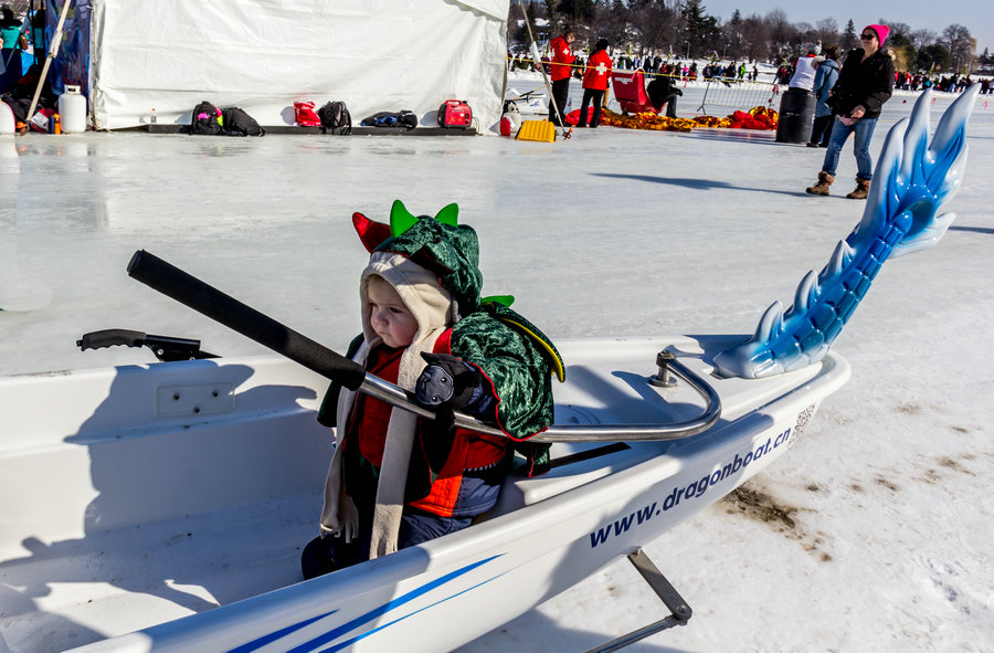 2017年2月18日,加拿大渥太華Dow’s Lake。今年是加拿大政府正式宣布農(nóng)歷正月初一到十五為中國春節(jié)的第一年,同時(shí)正好也是加拿大國慶150周年。經(jīng)過中加兩國政府的共同努力,專門從中國定制的冰上龍舟在渥太華冰雪節(jié)閃亮登場(chǎng)。此次北美冰上龍舟賽共有包括來自加拿大和美國的60支隊(duì)伍參賽,受到了廣泛關(guān)注。[攝影:張廷華]
