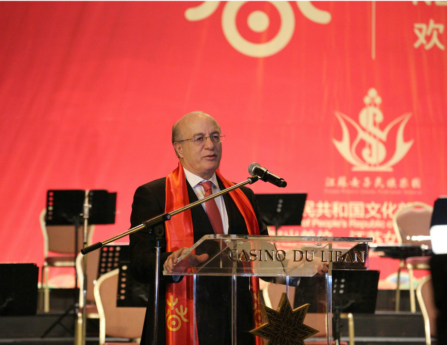 The Chinese embassy in Lebanon holds a Chinese New Year Concert at the theater of Casino du Liban on Feb 17, 2017. Lebanon's Culture Minister Ghattas Khouri gives a speech. [Photo/Bi Jie]