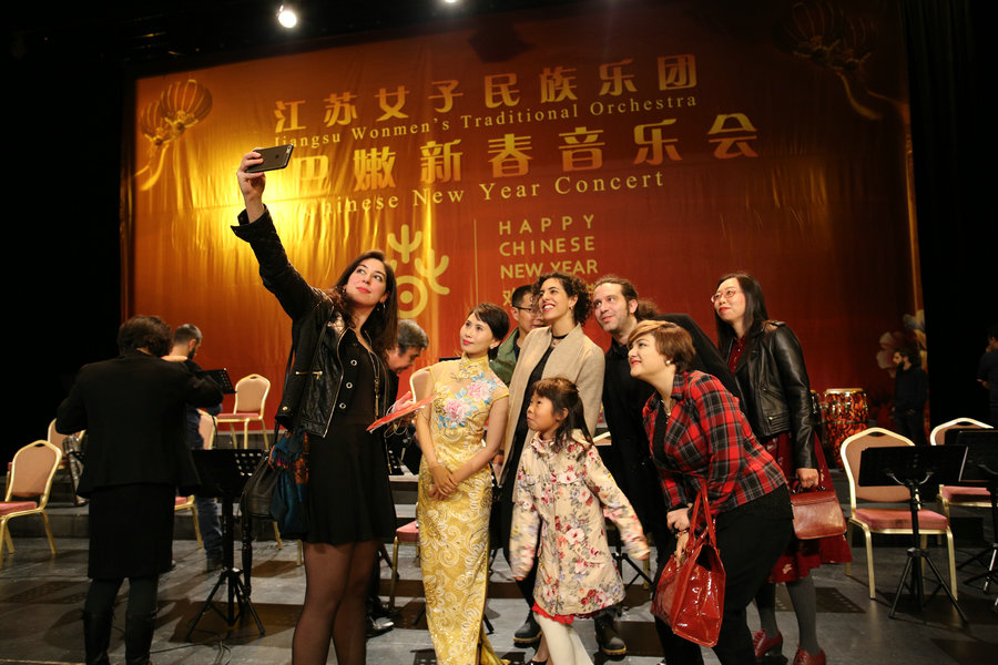 Music fans pose for a picture with a musician after the concert at the theater of Casino du Liban on Feb 17, 2017. [Photo/Bi Jie]