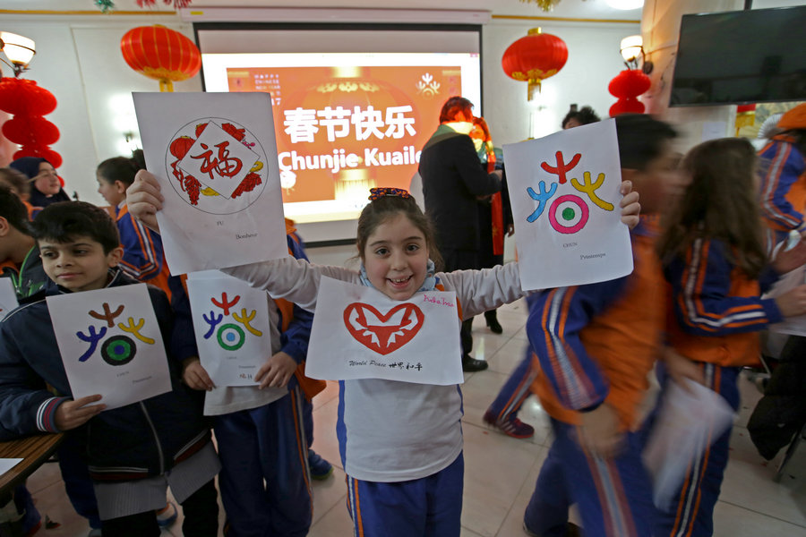 Lebanese children from a local school display their wishes for world peace and good fortune during the Chinese Culture Festival at the Chinese embassy with their teachers and parents. They wrote down their wishes to spread the joy of Chinese New Year on Feb 1, 2017. [Photo/Bi Jie]