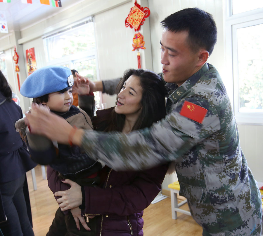 駐黎巴嫩維和部隊(duì)與黎各界友人、華人華僑、中資企業(yè)新春大聯(lián)歡活動(dòng)結(jié)束后,小朋友把維和官兵的帽子戴到自己的頭上,說(shuō)長(zhǎng)大后要像叔叔一樣保衛(wèi)國(guó)家。[攝影:畢潔]