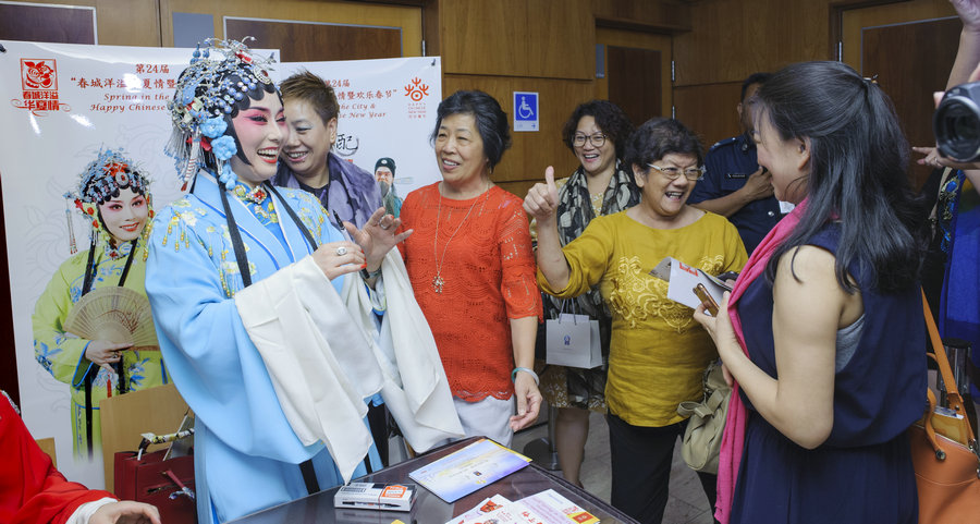 The Fujian Provincial Min Opera Theatre presents the classic Marriage of Plum and Jade at the Esplanade in Singapore on Jan 21, 2017. The lead singer talks with opera fans after the show. [Photo/Gao Yunqing]