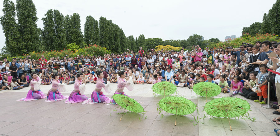 The Cixi Porcelain Music Troupe performs at Singapore's Presidential Palace on Jan 29, 2017, attracting many locals and tourists who stopped to watch. [Photo/Gao Yunqing]