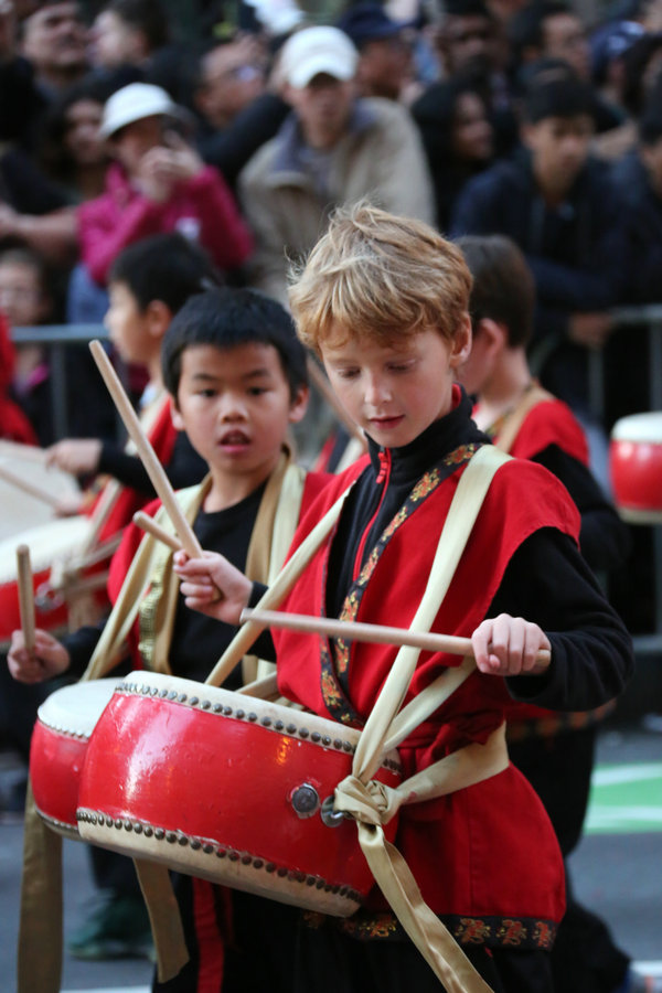 2017年2月11日,舊金山中國新年大巡游組圖(三):有模有樣的小鼓手。[攝影:汪俊]