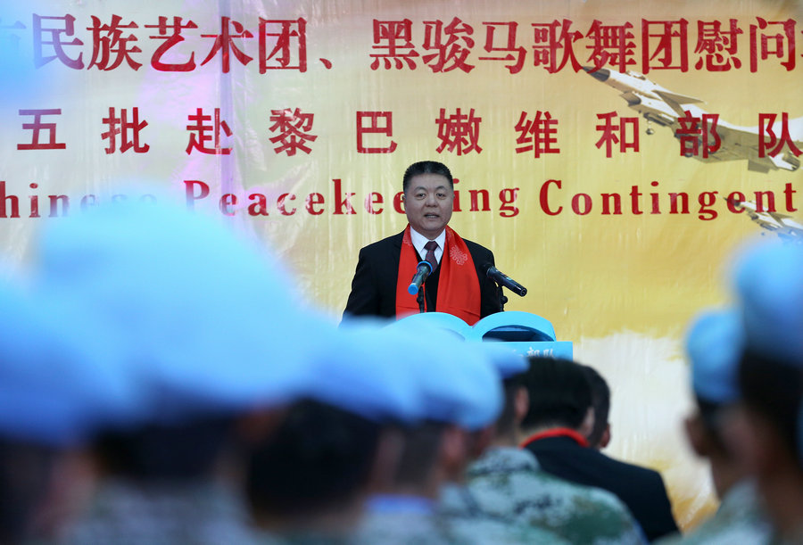2017年大年初三中國駐黎巴嫩使館、內(nèi)蒙古東方民族藝術團、天津黑駿馬歌舞團到聯(lián)合國駐黎巴嫩中國分隊營地慰問中國第十五批維和部隊官兵,以《為和平而來》為主題的歌舞表演向維和官兵轉達祖國人民對官兵們的親切慰問。中國駐黎巴嫩大使王克儉向維和部隊官兵致以節(jié)日的祝福慰問和勉勵。[攝影:熊志華]