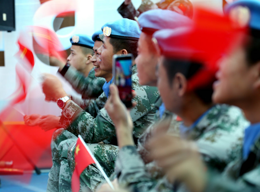 2017年大年初三中國駐黎巴嫩使館、內(nèi)蒙古東方民族藝術(shù)團、天津黑駿馬歌舞團到聯(lián)合國駐黎巴嫩中國分隊營地慰問中國第十五批維和部隊官兵,以《為和平而來》為主題的歌舞表演向維和官兵轉(zhuǎn)達(dá)祖國人民對官兵們的親切慰問。[攝影:熊志華]