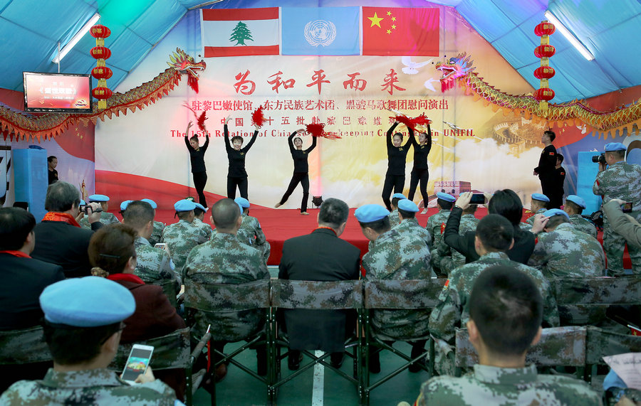 2017年大年初三中國駐黎巴嫩使館、內(nèi)蒙古東方民族藝術(shù)團(tuán)、天津黑駿馬歌舞團(tuán)到聯(lián)合國駐黎巴嫩中國分隊(duì)營地慰問中國第十五批維和部隊(duì)官兵,以《為和平而來》為主題的歌舞表演向維和官兵轉(zhuǎn)達(dá)祖國人民對官兵們的親切慰問。[攝影:熊志華]