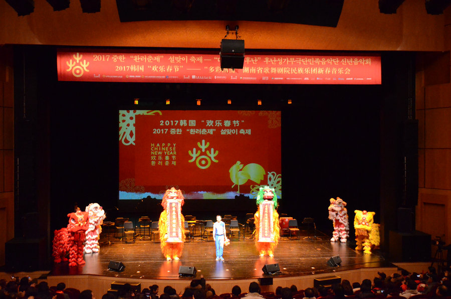 1月13日,湖南省舞獅表演走進韓國安山市給華人華僑拜年。[攝影:高寧]
