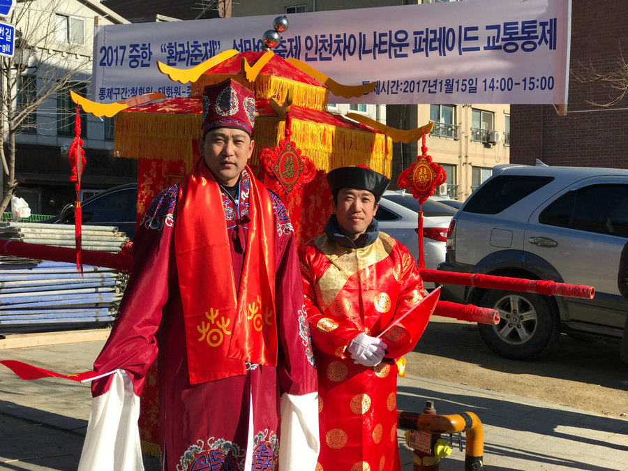 1月15日,在韓華人華僑參與韓國仁川中華街舞獅巡游活動。[攝影:高寧]