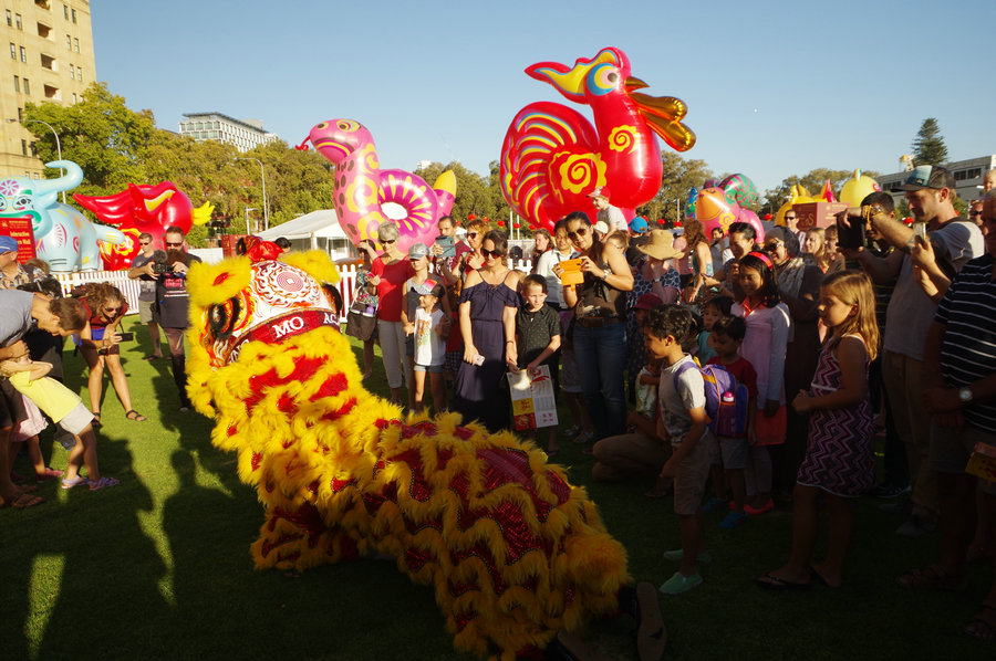 與金獅共舞 2017年1月27日,澳大利亞的西部城市珀斯市中心廣場舉辦春節(jié)慶祝活動。[攝影:陳慶霞]