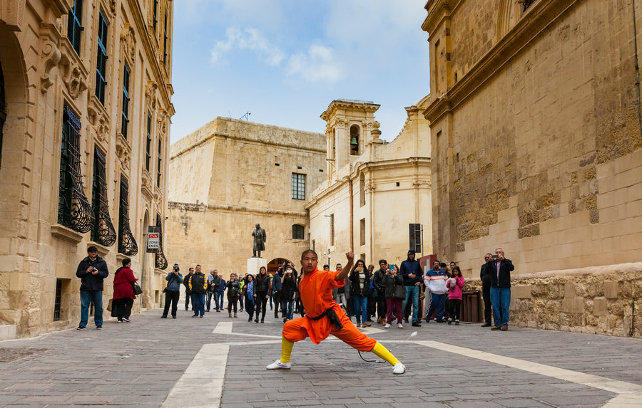 歡樂春節(jié)巡游表演 馬耳他共和國的中國春節(jié)期間,河南少林武僧等在首都瓦萊塔進行了巡游表演,收到了當(dāng)?shù)鼐用窈陀慰偷臒崆闅g迎。[攝影:李民]