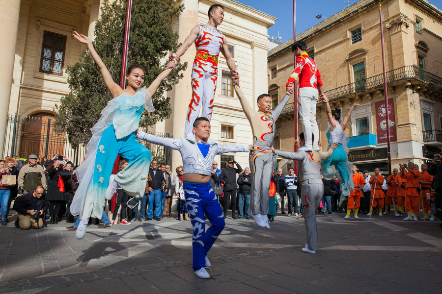 歡樂春節(jié)巡游表演 馬耳他共和國(guó)的中國(guó)春節(jié)期間,河南少林武僧等在首都瓦萊塔進(jìn)行了巡游表演,收到了當(dāng)?shù)鼐用窈陀慰偷臒崆闅g迎。[攝影:李民]