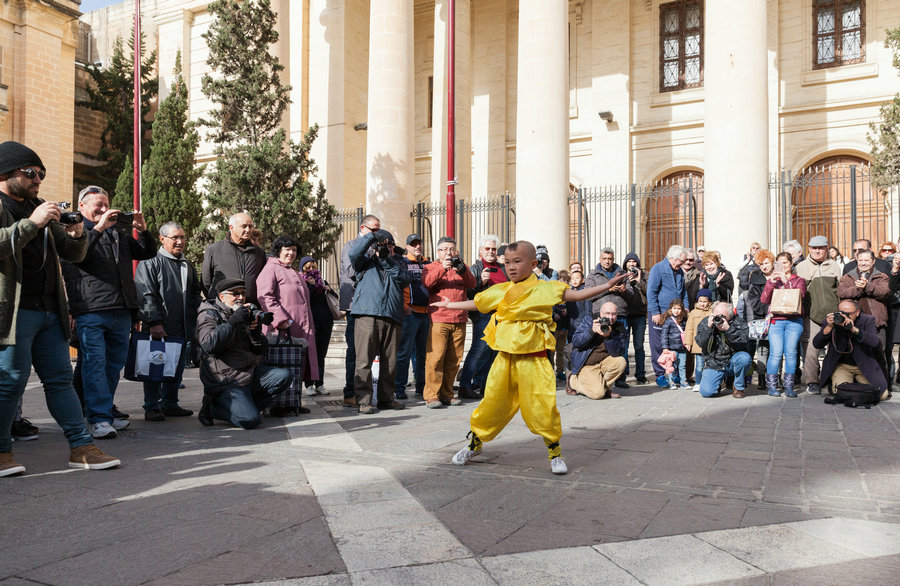 馬耳他共和國的中國春節(jié)期間,河南少林武僧等在首都瓦萊塔進(jìn)行了巡游表演,收到了當(dāng)?shù)鼐用窈陀慰偷臒崆闅g迎。[攝影:李民]
