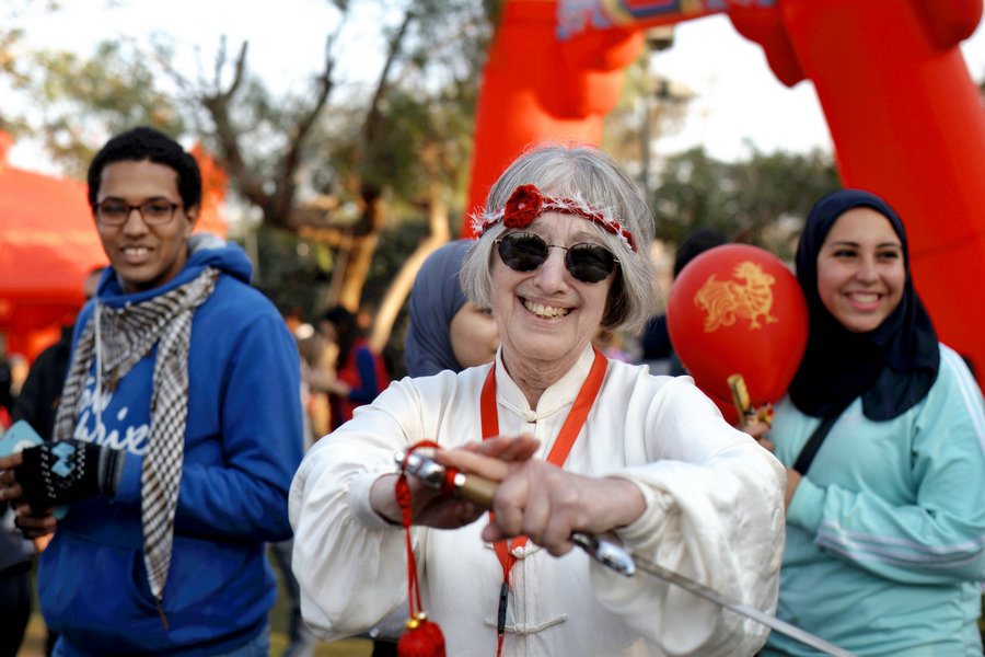 在埃及開羅舉辦的中國(guó)華人廟會(huì)上,一位穿著中國(guó)傳統(tǒng)太極服裝的老人表演太極。[攝影:勉小燕]