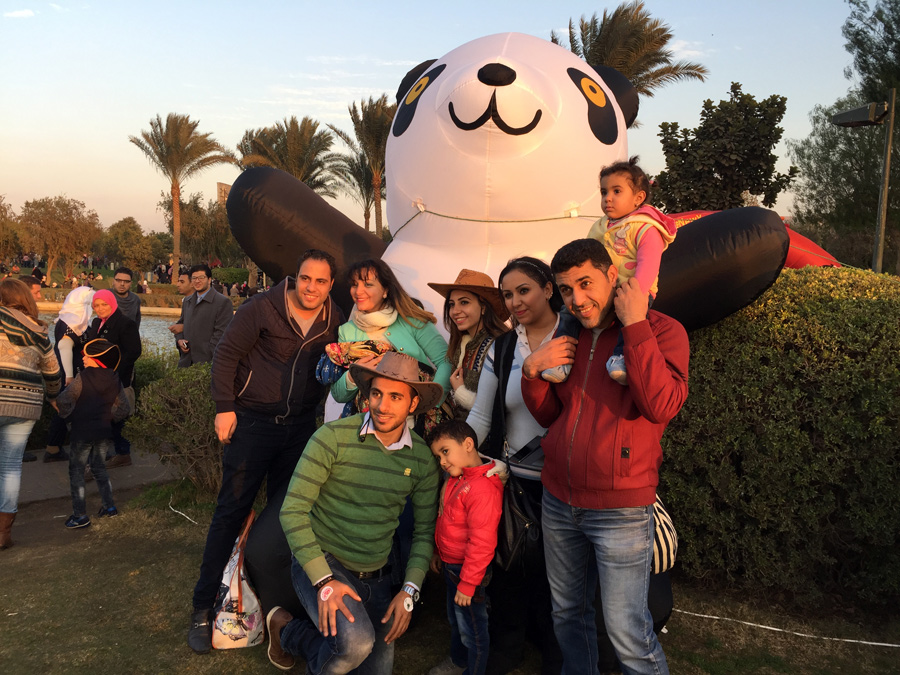中國(guó)熊抱——1月20日下午,第八屆埃及“歡樂春節(jié)”大廟會(huì)在首都開羅的愛資哈爾公園舉行,一萬多名中埃游客在中國(guó)傳統(tǒng)節(jié)日“小年”這一天,在明媚的陽(yáng)光下,在喜慶熱鬧的氣氛中共同迎接“雞年”的到來。圖為埃及民眾與中國(guó)熊貓合影。[攝影:劉世平]
