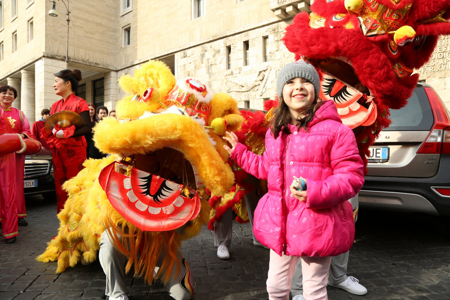 意大利萌寶貝與”中國獅子“的合影 1月28日是農(nóng)歷正月初一,意大利羅馬市中心又迎來了一年一度的“歡樂春節(jié)”大型文化慶?;顒?。舞獅表演吸引了很多意大利民眾前來觀看,他們對演出贊不絕口。一名來自意大利的小女孩被舞獅表演深深吸引了,她湊上前去,撫摸著獅子的頭部,露出了開心的微笑。[攝影:劉慶輝]