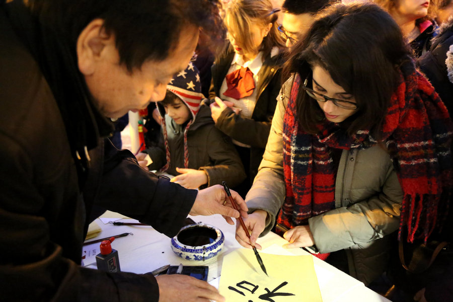 福字迎春 1月28日是農(nóng)歷正月初一,意大利羅馬市中心又迎來了一年一度的“歡樂春節(jié)”大型文化慶?;顒?。在精彩的游園會現(xiàn)場,意大利羅馬大學(xué)孔子學(xué)院的“福臨門”展臺向意大利民眾展示著中國毛筆字的魅力,來自中國的中國老師們教他們用毛筆字寫福字,他們的臉上浮現(xiàn)著好奇又興奮的微笑。[攝影:劉慶輝]