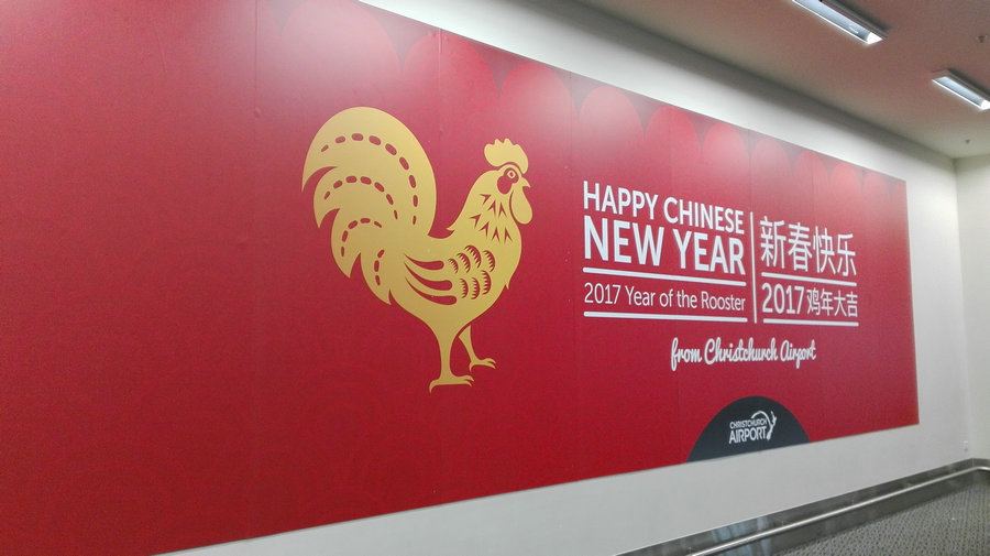 新西蘭基督城國際機場掛上大紅海報祝賀中國春節(jié)。[攝影:李新月]
