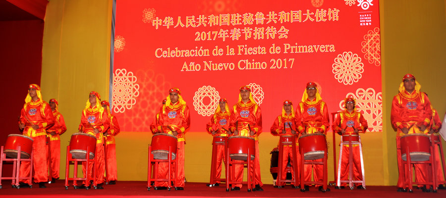 1月24日,駐秘魯使館2017“歡樂春節(jié)”迎新招待會上,若望二十三世秘中學(xué)校的學(xué)生表演的中國鼓將歡樂氣氛推向高潮。[攝影:Julio Cesar Barriga]