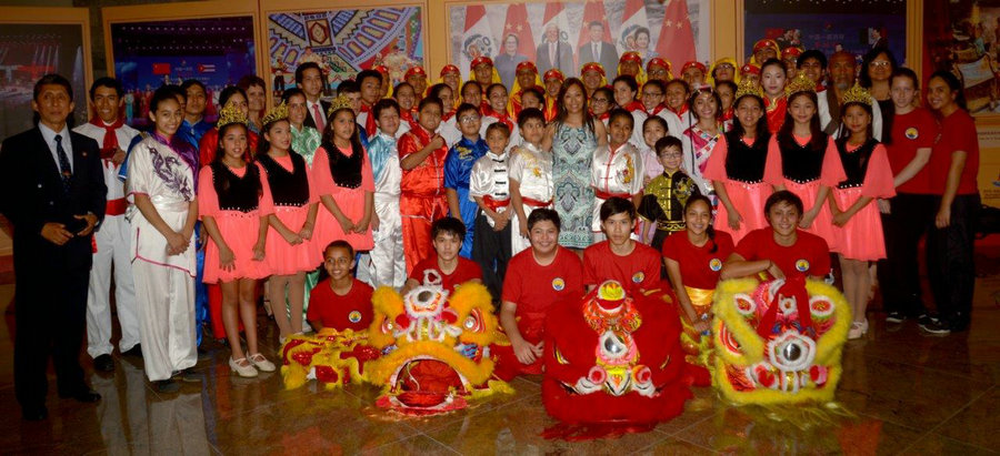 1月24日,駐秘魯使館2017“歡樂(lè)春節(jié)”迎新招待會(huì)上,若望二十三世秘中學(xué)校的學(xué)生們?cè)谥欣幕涣髂瓿晒骨昂嫌?,紀(jì)念中秘關(guān)系中重要一年。[攝影:Julio Cesar Barriga]