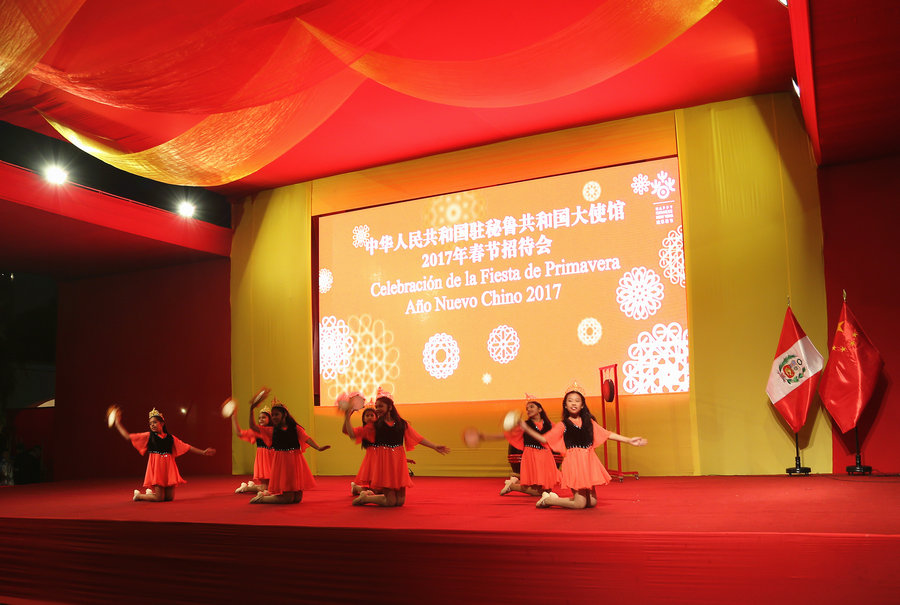 1月24日,駐秘魯使館2017“歡樂春節(jié)”迎新招待會上,若望二十三世秘中學(xué)校的學(xué)生們表演的新疆舞活潑可愛。[攝影:Julio Cesar Barriga]