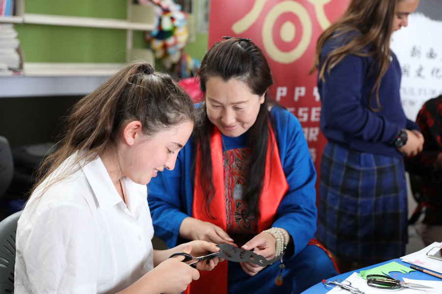 新西蘭女生體驗“歡樂春節(jié)”非遺展演之民間剪紙。[攝影:方華]