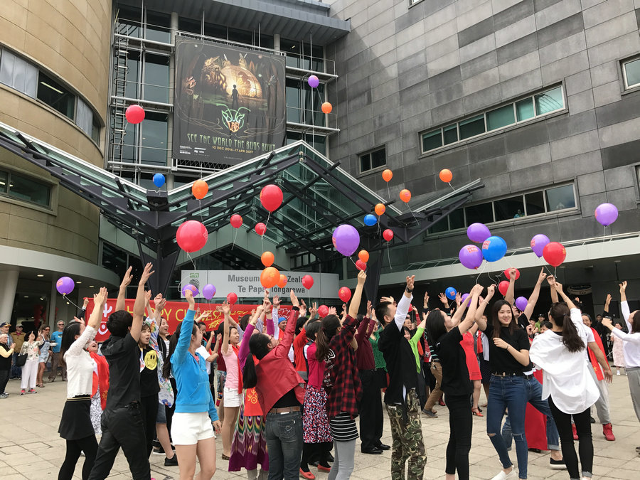 新西蘭國家博物館廣場前方升起“歡樂春節(jié)”彩色汽球。[攝影:方華]