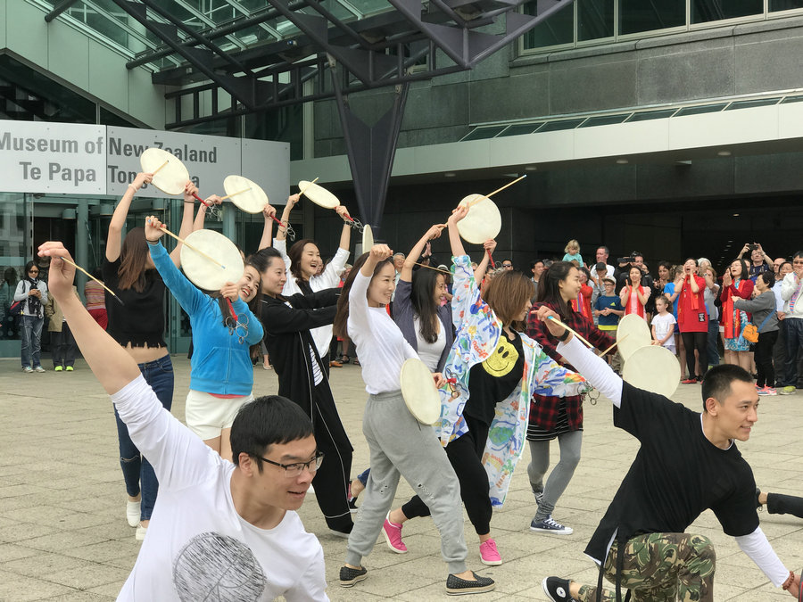 新西蘭國(guó)家博物館廣場(chǎng)前方迎來(lái)“歡樂(lè)春節(jié)”快閃表演。[攝影:方華]