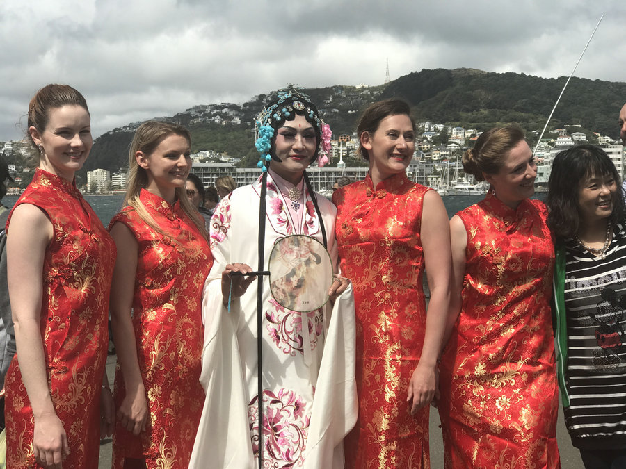 新西蘭首都“歡樂春節(jié)”花車巡游的旗袍演員與京劇青衣扮演者。[攝影:方華]