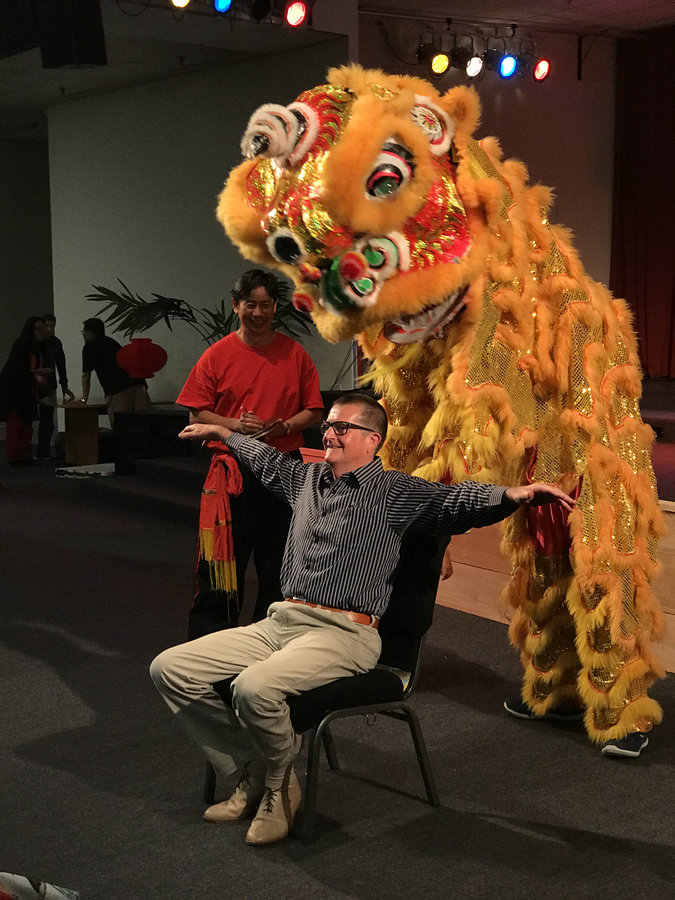 在哈特區(qū)中國新年廟會上,上哈特市長與獅共舞。[攝影:方華]