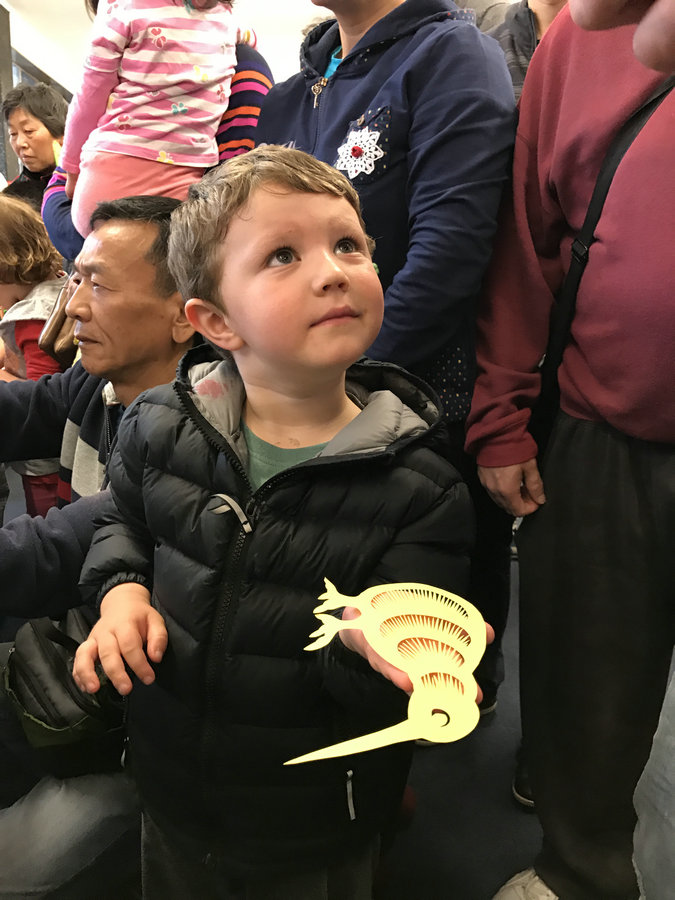 新西蘭兒童對(duì)”歡樂(lè)春節(jié)“非遺剪紙作品幾維鳥(niǎo)十分好奇。[攝影:方華]