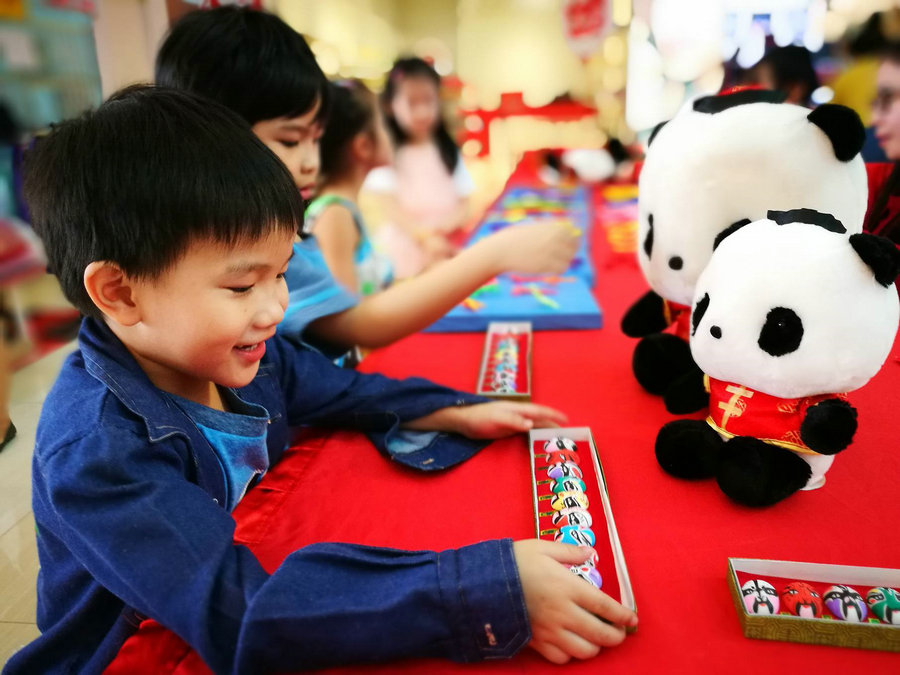 由中國文化部和駐老撾大使館主辦,在老撾萬象中心舉行的“2017歡樂春節(jié)廟會”上,老撾的孩子看到展臺上的臉譜,臉上馬上露出燦爛的笑容。[攝影:周明秀]