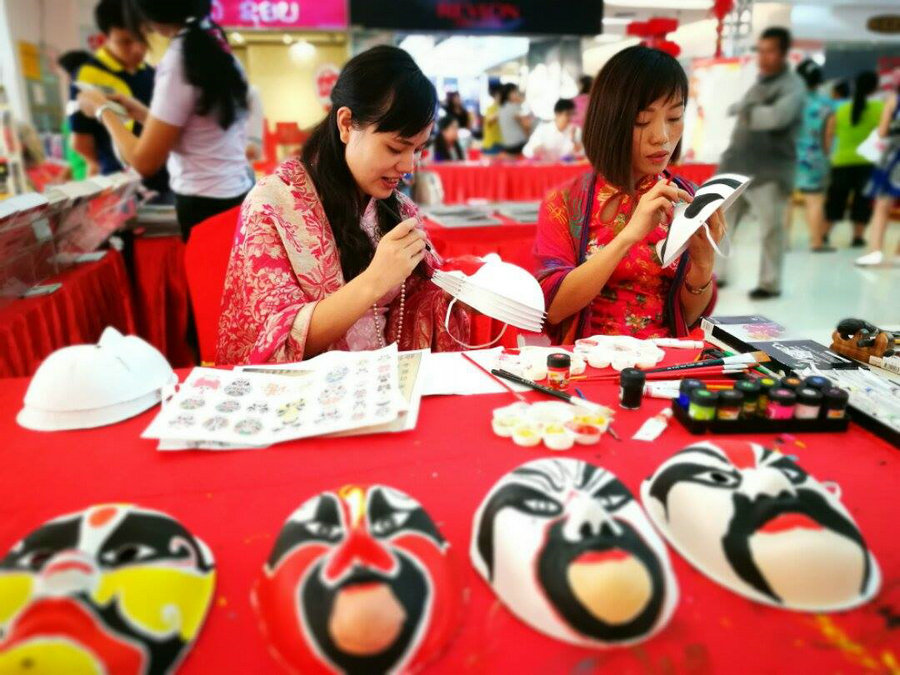 繪臉譜——由中國文化部和駐老撾大使館主辦,在老撾萬象中心舉行的“2017歡樂春節(jié)廟會”活動上,兩位身著旗袍的中國女子聚精會神地現(xiàn)場展示繪制臉譜,展示中國文化的魅力。[攝影:周明秀]