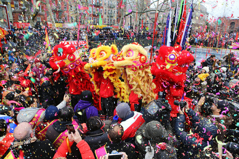 樂喧天——2016年2月8日,紐約華埠羅斯福公園,燃放炮仗前普天同慶的歡樂景象。[攝影:曾乃斌]