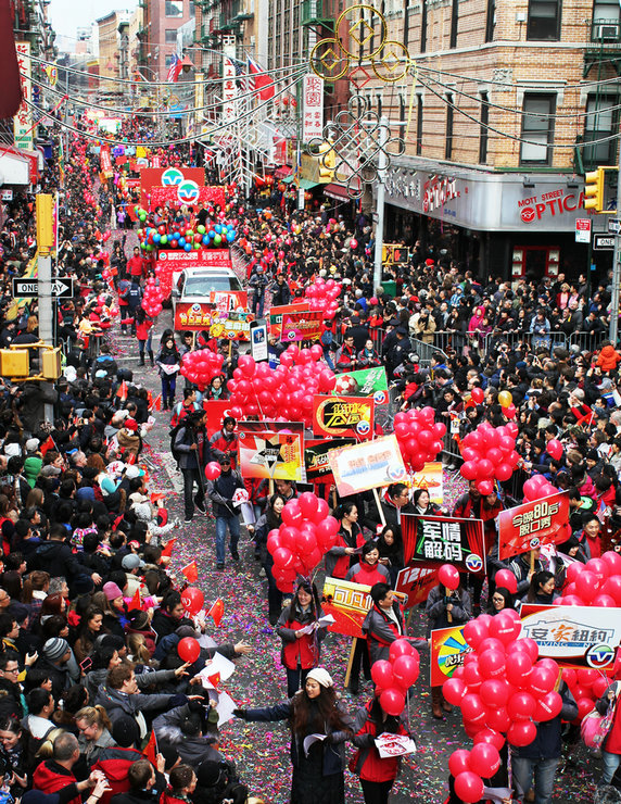 花車連延慶新年——2014年2月2日,紐約唐人街新春游行。[攝影:曾乃斌]