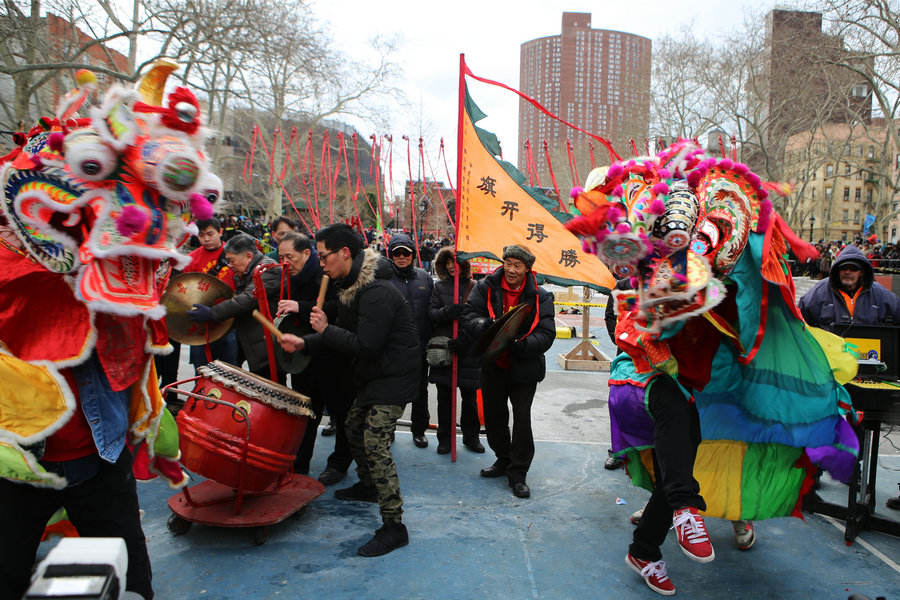 旗開得勝——2015年2月19日,紐約華埠羅斯福公園,—年—度的慶新春炮竹嘉年華在熱鬧歡快的鑼鼓聲中精彩上演。[攝影:曾乃斌]