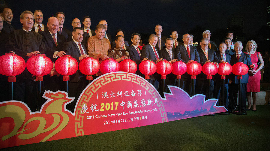 悉尼點(diǎn)亮中國紅——2017年中國農(nóng)歷新年除夕夜,“澳大利亞各界慶祝中國農(nóng)歷新年晚會(huì),中澳來賓一起按動(dòng)亮紅燈籠,歌劇院馬上染上迷人的中國紅。[攝影:曾漢超]