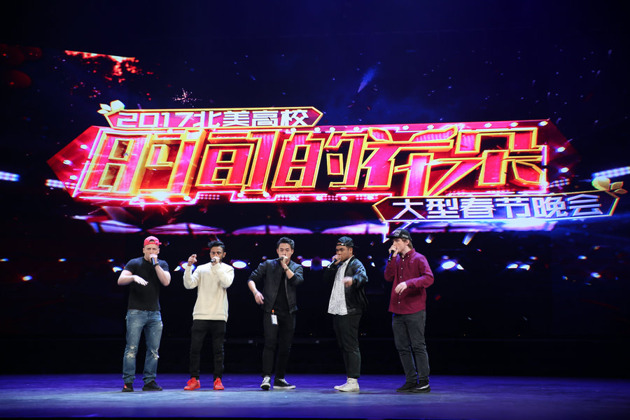 1月21日晚,由北美32所名校的中美師生代表聯(lián)袂國內(nèi)藝術(shù)家們在紐約州立大學(xué)舉辦“時間的花朵——2017北美高校大型春節(jié)晚會”。作為中國文化部2017“歡樂春節(jié)”活動項目之一,本臺晚會以“春節(jié)、春天、青春”為主基調(diào),以“夢想照耀現(xiàn)實,青春決定未來”為主題,表達(dá)了中國留學(xué)生和美國青年對于世界和未來的暢想,傳遞了世界青年攜手共進、共創(chuàng)美好未來的心愿。圖為中美青年學(xué)生聯(lián)袂演出B-BOX京劇“打虎上山”。[攝影:李睿涵]