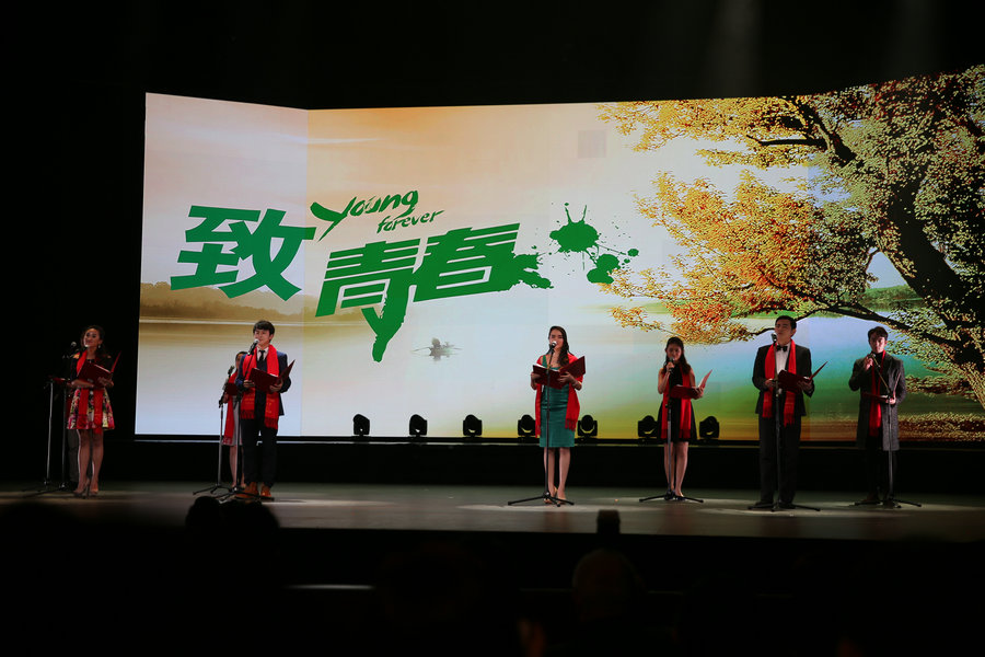 1月21日晚,由北美32所名校的中美師生代表聯(lián)袂國內(nèi)藝術(shù)家們?cè)诩~約州立大學(xué)舉辦“時(shí)間的花朵——2017北美高校大型春節(jié)晚會(huì)”。作為中國文化部2017“歡樂春節(jié)”活動(dòng)項(xiàng)目之一,本臺(tái)晚會(huì)以“春節(jié)、春天、青春”為主基調(diào),以“夢(mèng)想照耀現(xiàn)實(shí),青春決定未來”為主題,表達(dá)了中國留學(xué)生和美國青年對(duì)于世界和未來的暢想,傳遞了世界青年攜手共進(jìn)、共創(chuàng)美好未來的心愿。圖為青年學(xué)子們以詩歌朗頌禮贊青春。[攝影:李睿涵]