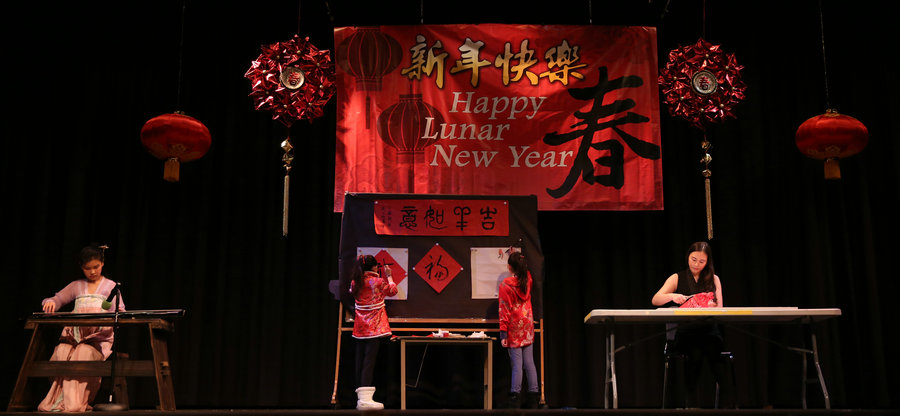 紐約當(dāng)?shù)厝A人青少年以書畫、剪紙、古琴等中國(guó)傳統(tǒng)文化藝術(shù)表演歡慶雞年新春。[攝影:李睿涵]